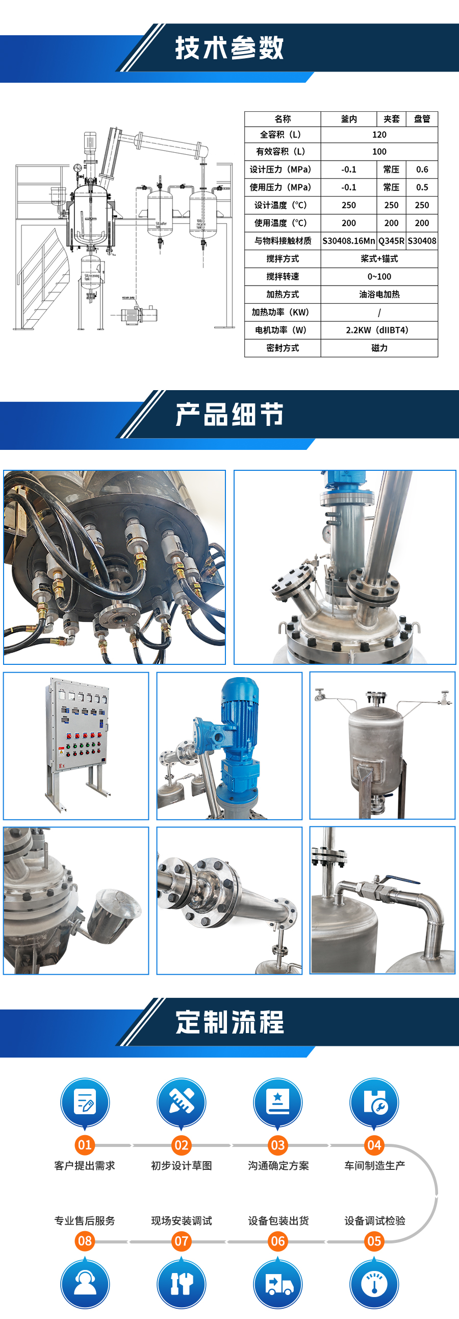 如果用戶在釜蓋、釜體開口、內(nèi)部結(jié)構(gòu)、壓力高低、攪拌槳葉、及增加其他輔助裝置(如冷凝回流裝置、冷凝器、恒壓加料罐、接收裝置)等有特殊要求,可完全按用戶的要求加工制造 |