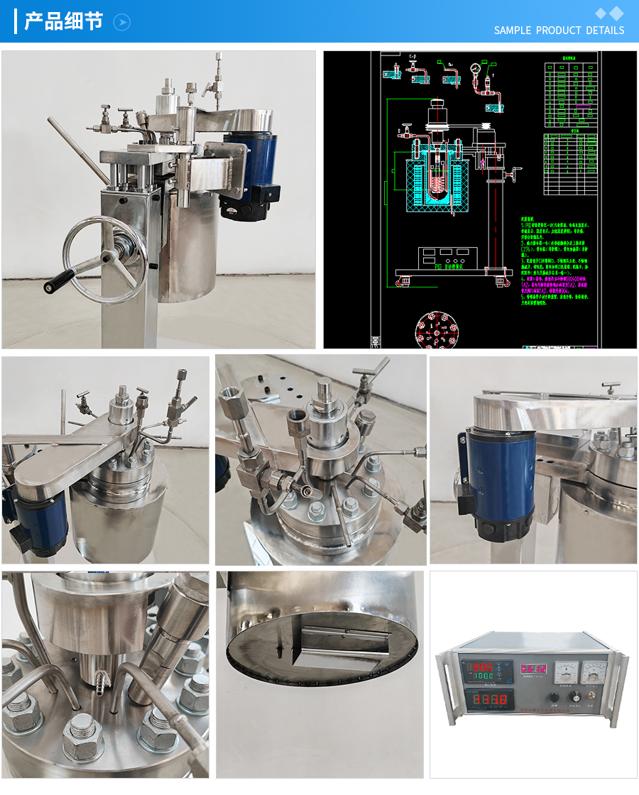常規(guī)釜蓋開口 氣相口配針形閥,液相口配針形閥及釜內插底管,固體加料口配絲堵,測控溫口配鉑電阻,壓力表安全爆破口配壓力表及安全防爆裝置,釜內冷卻盤管進、出口配水咀